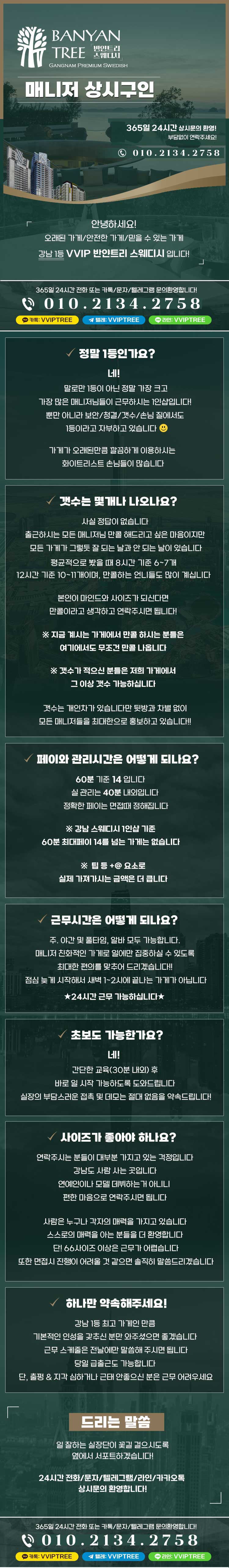 본 정보는 반얀트리스웨디시에서 제공한 자료이며, 밤이슬알바는 기재된 내용에 대한 오류와 사용자가 이를 신뢰하여 취한 조치에 대해 책임을 지지 않습니다. 또한 누구든 본 정보를 밤이슬알바의 동의 없이 재배포 할 수 없습니다.