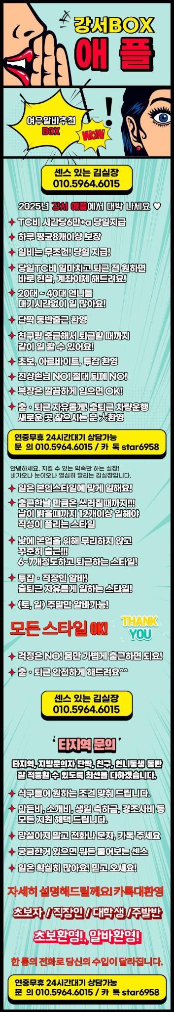 본 정보는 ❣️기쁨조❣️에서 제공한 자료이며, 밤이슬알바는 기재된 내용에 대한 오류와 사용자가 이를 신뢰하여 취한 조치에 대해 책임을 지지 않습니다. 또한 누구든 본 정보를 밤이슬알바의 동의 없이 재배포 할 수 없습니다.